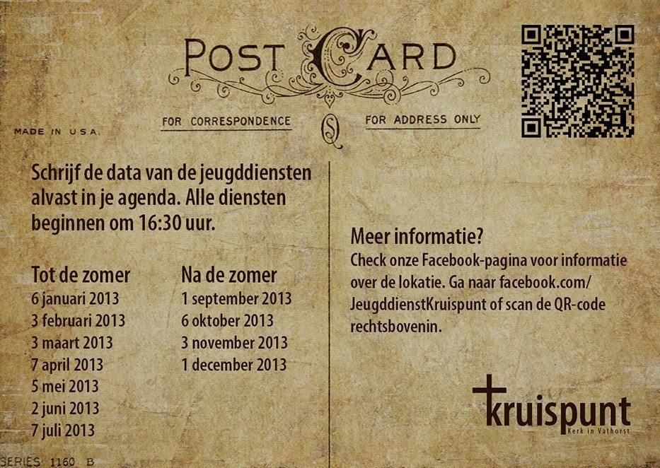 Vanaf 2013 wordt er door de Kruispunt-gemeente in Amersfoort Vathorst op elke eerste zondag van de maand een jeugddienst georganiseerd. Om de jeugddiensten te promoten hebben we een huisstijl en diverse promotiematerialen ontworpen.