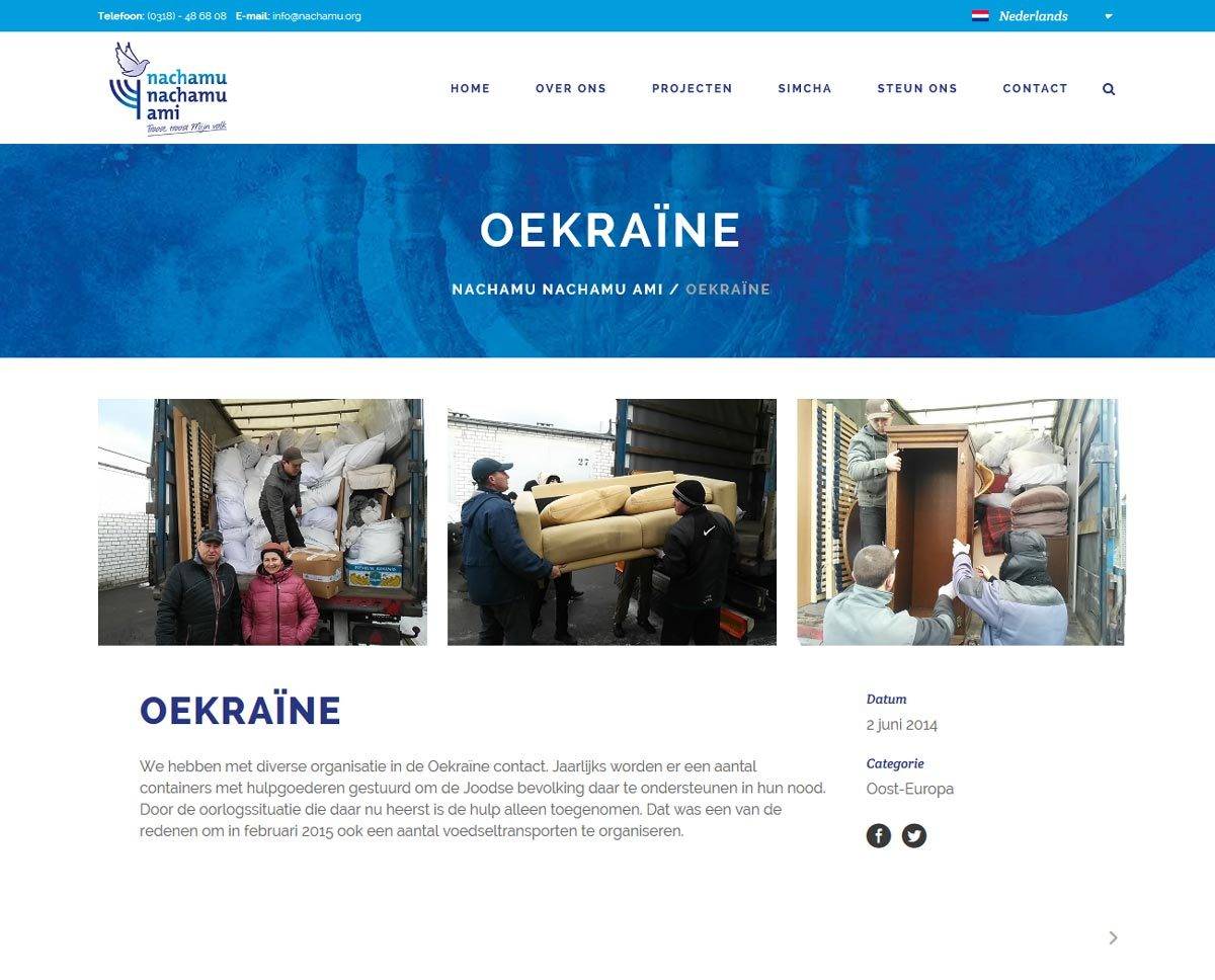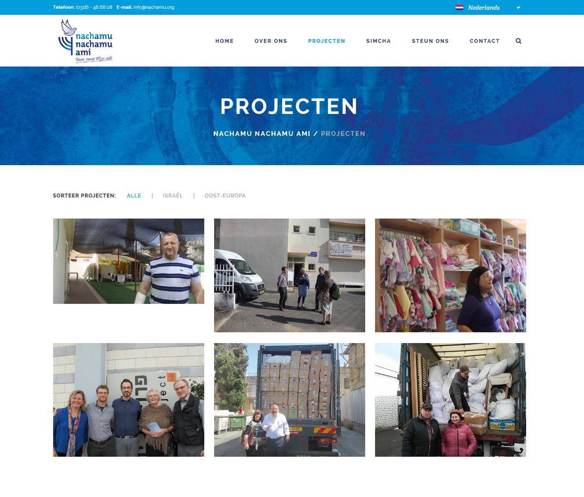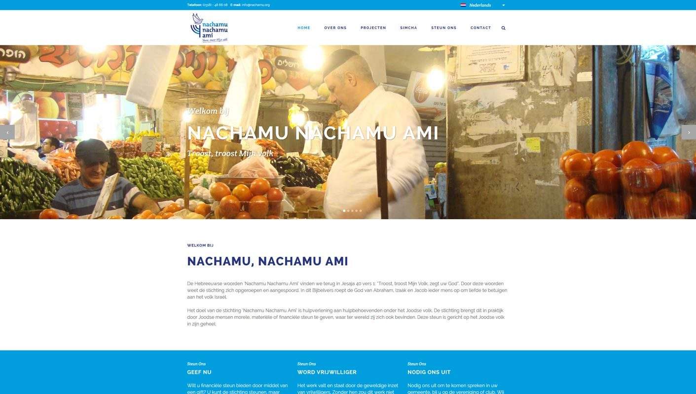 De website moest overzichtelijk zijn en meteen duidelijk maken waar Nachamu Nachamu Ami voor staat. We hebben gekozen voor de kleuren blauw en wit, omdat dit in het logo terugkomt. Omdat de stichting zich op Joden over de hele wereld richt, moest dit ook terugkomen in het visuele gedeelte van de website. Daarnaast wilden ze de projecten overzichtelijk op een pagina hebben.