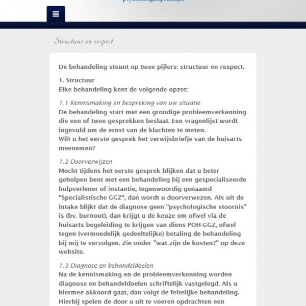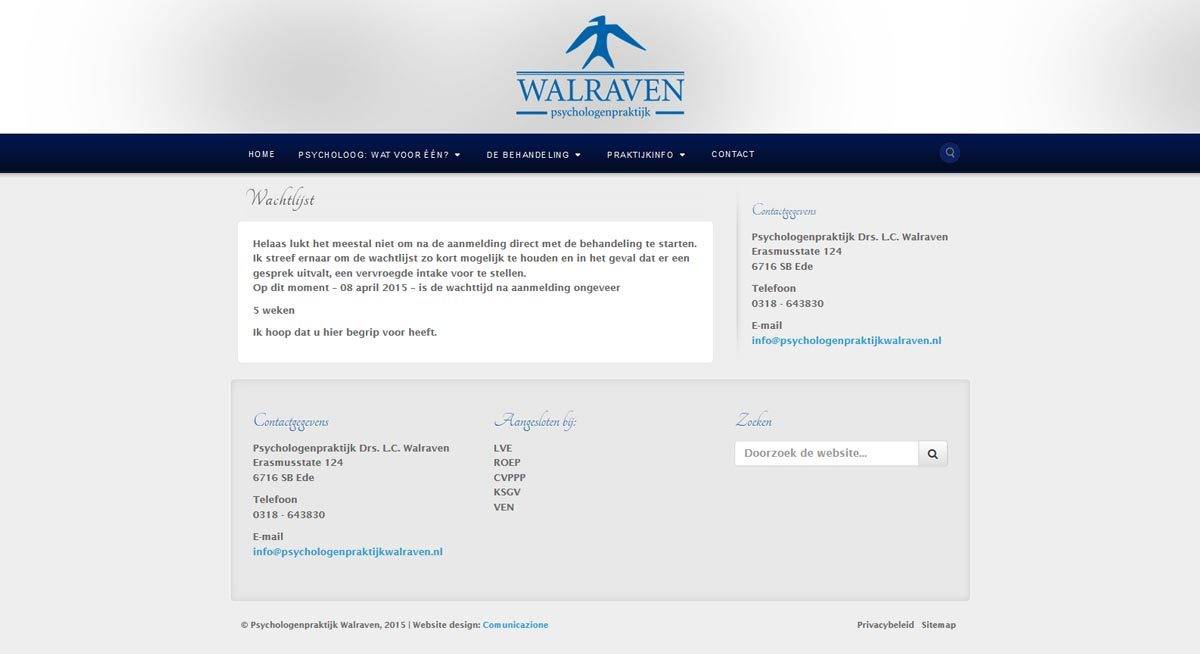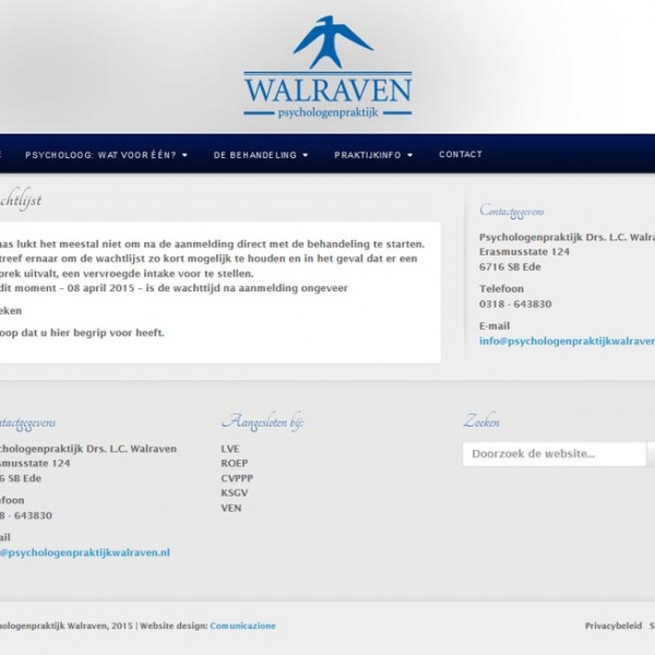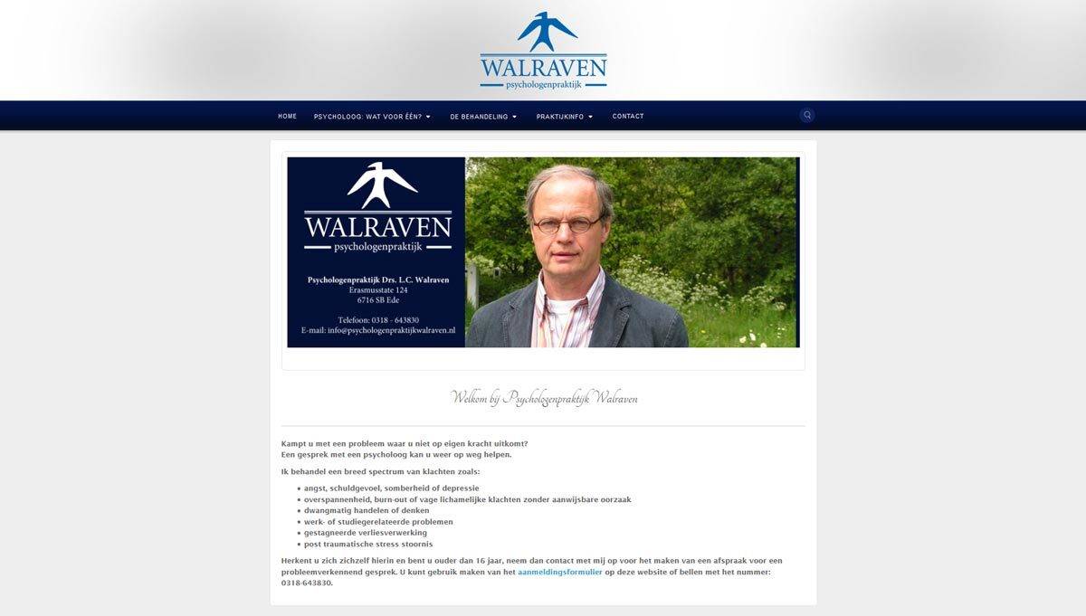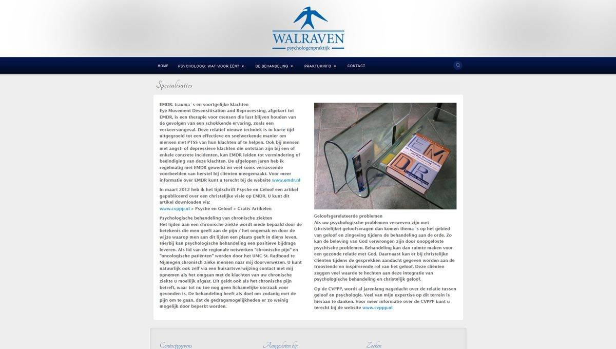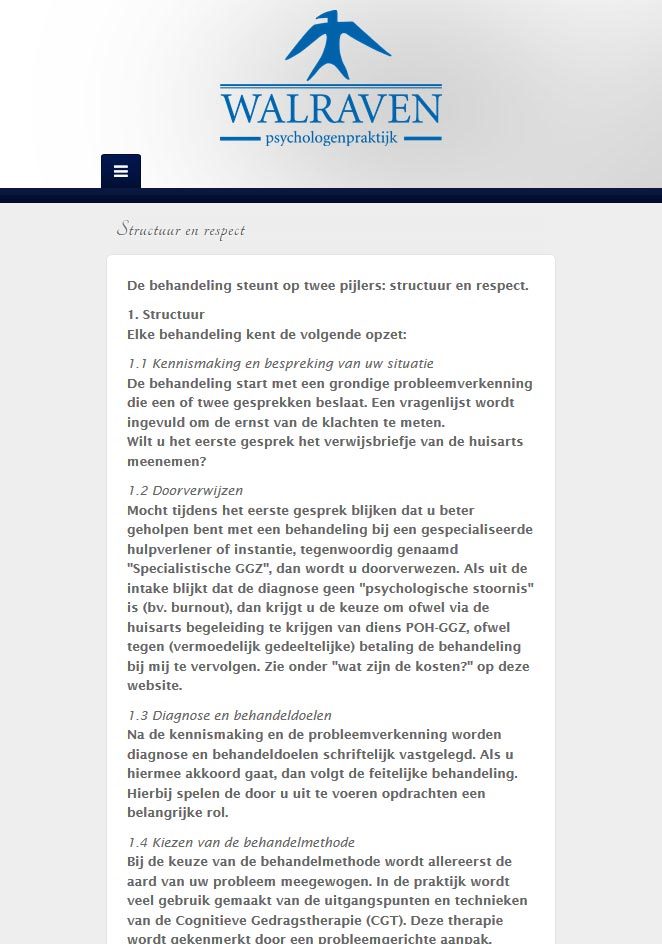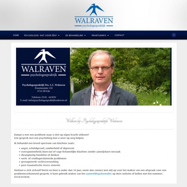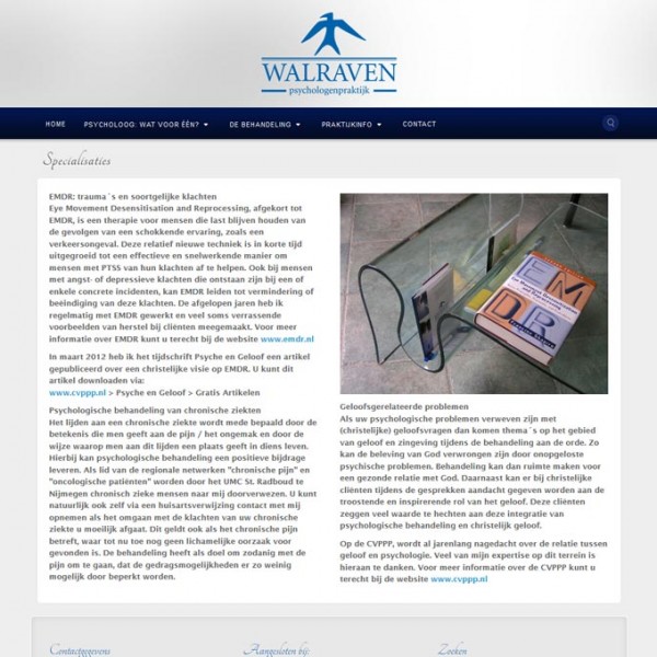 In mei 2011 hebben we een website ontworpen voor Psychologenpraktijk Walraven. De praktijk had al een eigen logo en huisstijl en daar moest het ontwerp bijpassen. Het logo was hierbij mijn uitgangspunt. Donkerblauw is een chique kleur en sluit ook goed aan bij het blauwe logo.