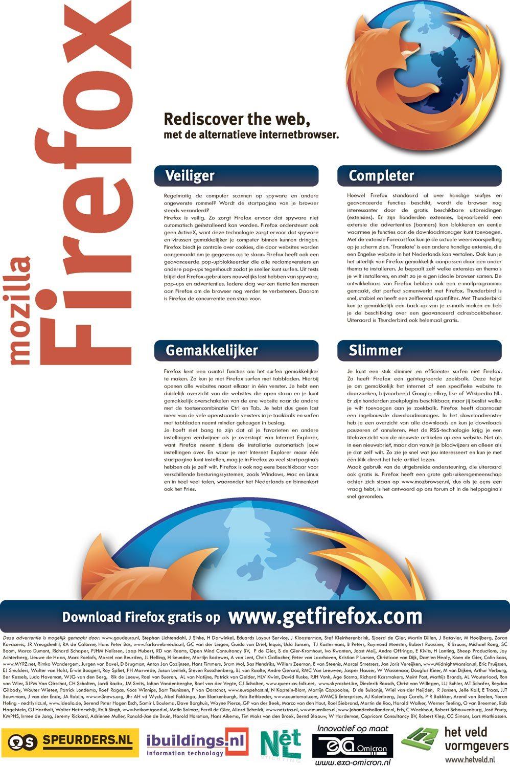 Een vormgevingsbureau heeft vervolgens kosteloos de advertentie ontworpen en alle namen van donateurs in de advertentie verwerkt. Van de overgebleven 1.000 euro hebben we posters laten drukken en die gratis verstuurd naar Firefox-gebruikers die de poster konden gebruiken om de advertentiecampagne kracht bij te zetten.