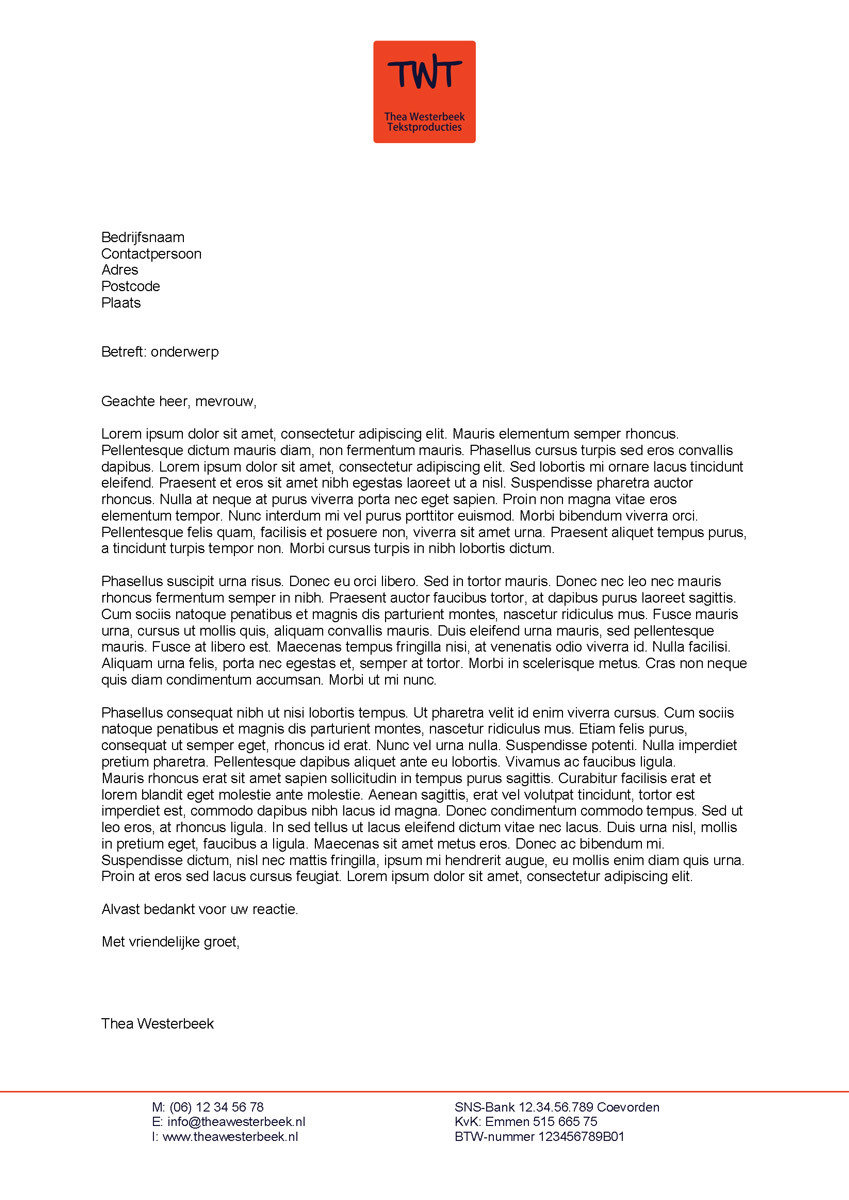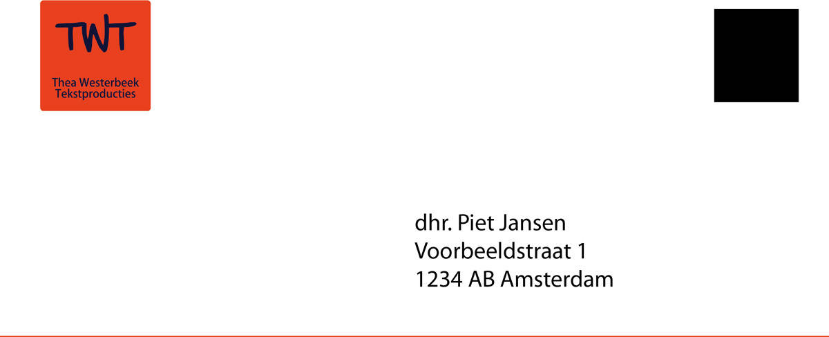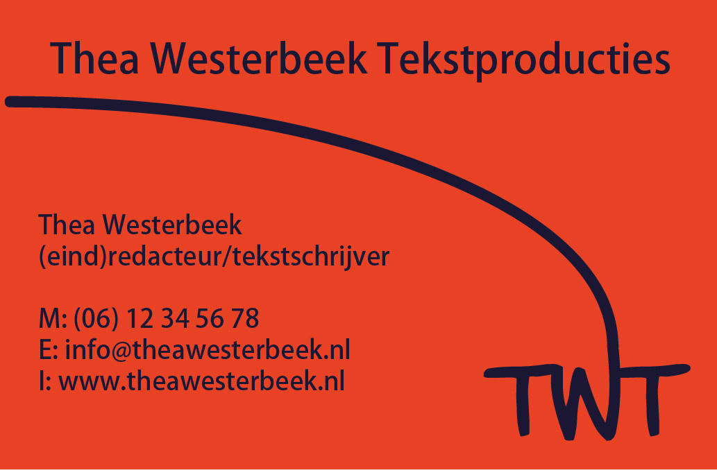 Van Thea Westerbeek kregen we het verzoek om een logo, visitekaartje, briefpapier en enveloppen te ontwerpen die aan zouden sluiten bij het kleurschema van haar huidige website. Ze wilde de kleuren oranjerood en donkerblauw als uitgangspunt gebruiken voor haar nieuwe huisstijl.